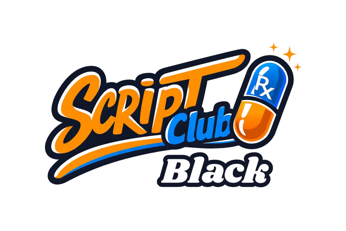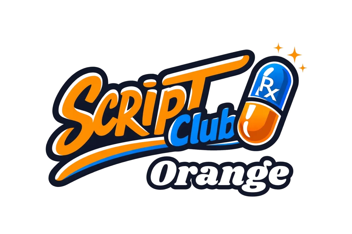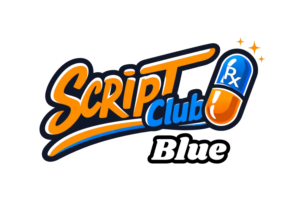 White prescription bottle with a blue ScriptClub label on a light background